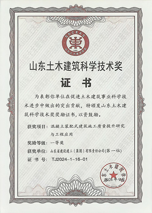 山東土木建筑科學技術獎:混凝土裝配式建筑施工質量提升研究與工程應用